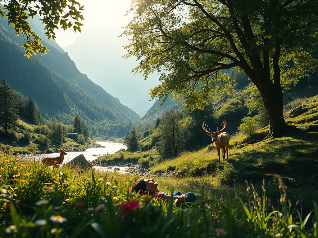 Subamos juntos la montaña empinada para admirar la naturaleza y contemplar la delicadeza del verde valle y de las coloridas laderas llenas de flores.
